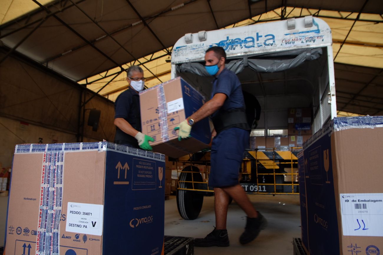 Nestas remessas, as doses da vacina Pfizer foram divididas entre os municípios de Belém e Ananindeua. A distribuição dessa imunização na região metropolitana atende questões técnicas e condições do próprio fabricante, pois que a vacina da Pfizer exige um transporte e armazenamento diferenciado. Exemplo. Ao chegar a Belém, as doses são transportadas em caminhão isotérmico, que atinge temperaturas de até -20 graus e entregues direto aos municípios. "A chegada de mais remessas ao Estado é de fundamental importância pois, dessa forma, vamos avançando na vacinação. Ressaltamos que todos fiquem atentos ao calendário de vacinação do seu município. Não deixem de tomar a segunda dose, pois só assim é possível completar o ciclo da imunização. Sigam tomando todos os cuidados como uso de máscara, álcool em gel e mantenham o distanciamento social", reforçou o secretário da Sespa, Romulo Rodovalho. Equipe do governo estadual recebe as vacinas da Pfizer, e prepara a logística para entrega na capital, Belém, e em AnanindeuaAs vacinas dessa remessa são destinadas para a imunização de pessoas com comorbidades, gestantes e puérperas com comorbidade e pessoas com deficiência permanente, trabalhadores da Educação do Ensino Básico, forças de segurança e salvamento e forças armadas e trabalhadores de transporte aéreo.