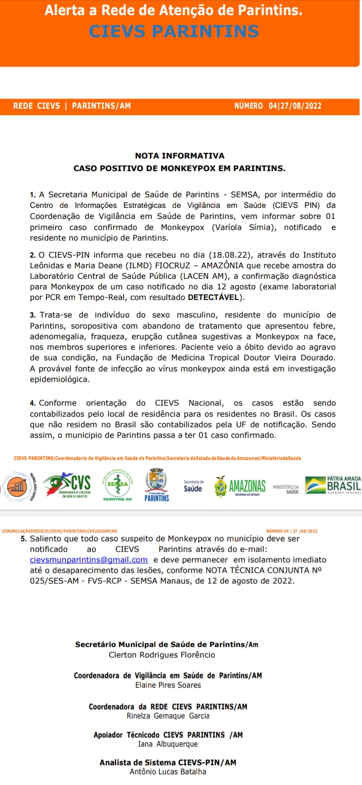 “O homem apresentou febre, adenomegalia, fraqueza, erupção cutânea sugestiva a Monkeypox na face, nos membros superiores e inferiores. O paciente veio a óbito devido ao agravo de sua condição, na Fundação de Medicina Tropical Doutor Vieira Dourado [em Manaus]”.